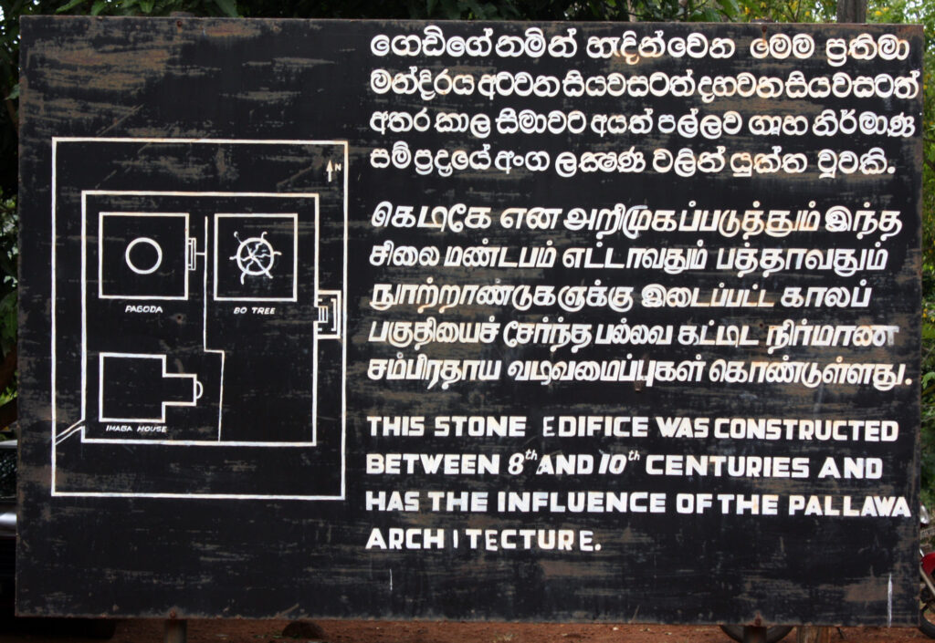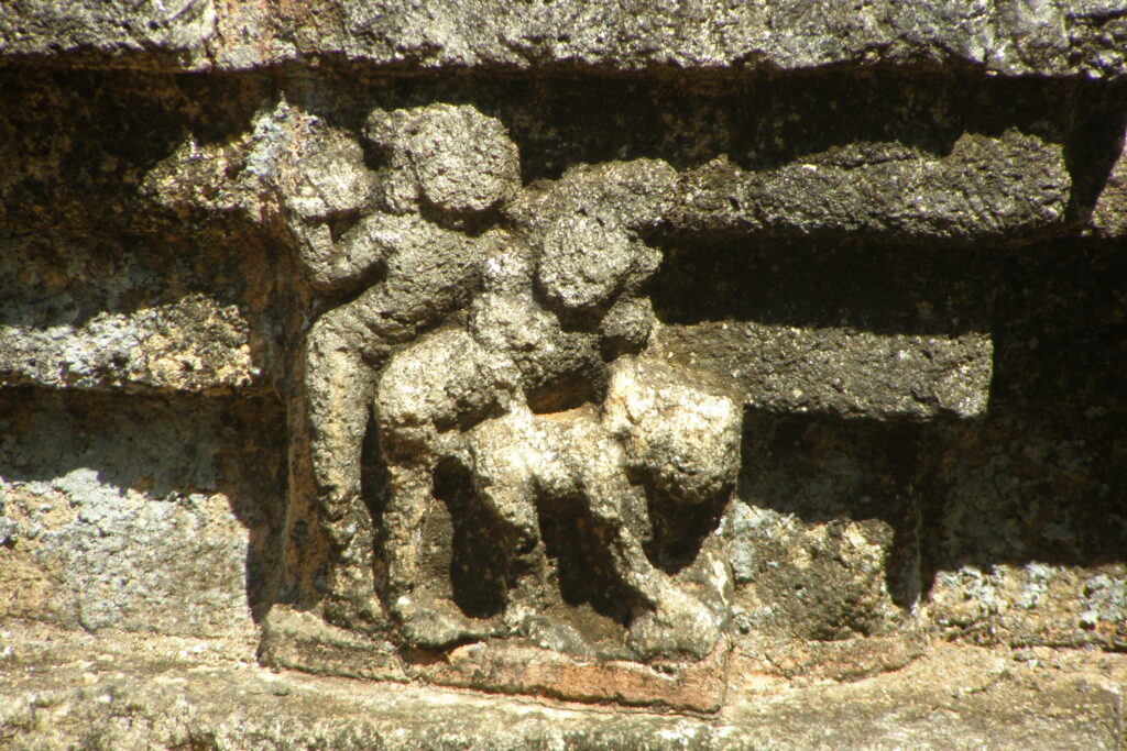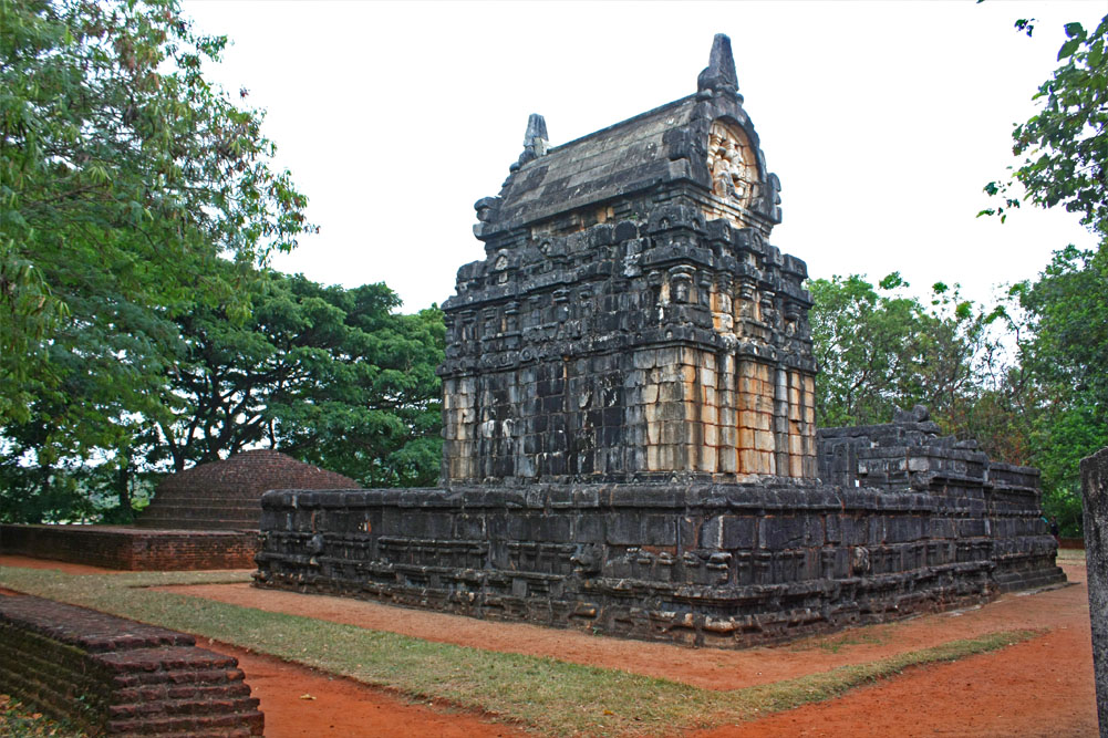 Roland Raven-Hart, writing in Ceylon: History in Stone (1964) describes this hybridation: “Elsewhere there are plenty of Hindu buildings, and plenty of Buddhist ones, and some muddled mongrels; but here the styles are interwoven. The ground plan is Buddhist, the vestibule pure Hindu and so is the little windowless shrine: the plain moonstone and crocodile balustrade and rivers of dwarfs and architrave of the doorway are Sinhalese, and jambs Tamilian; even the sculptures are fairly shared. The whole effect is charming and for me unexpectedly classical, nor did I find the exterior “over-richly decorated” as did Bell, though it is crowded with pilasters and horseshoe false windows and more jolly dwarfs. And the dome must have been a worthy climax when all its four faces were present, each with horseshoe niche and statue, instead of the one only which was found.”[6]