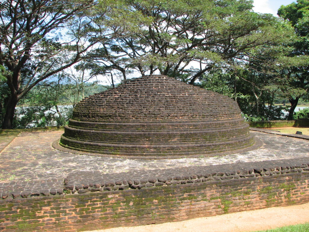 However, nothing transpired until much later, in the 1980s, when the shrine was threatened with inundation by the waters of the newly created Bowatenne Tank. The opportunity was taken to dismantle the ruin and rebuild it on the bund(retaining wall) of the tank, high above the waters. It stands now reconstructed beside the tank and is approached by a flower-edged causeway with a magnificent backdrop of tree-clad hills.[6]